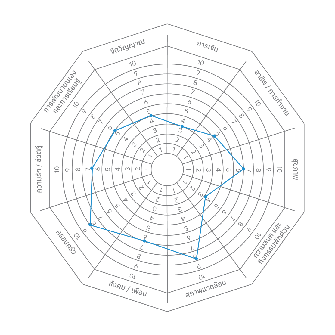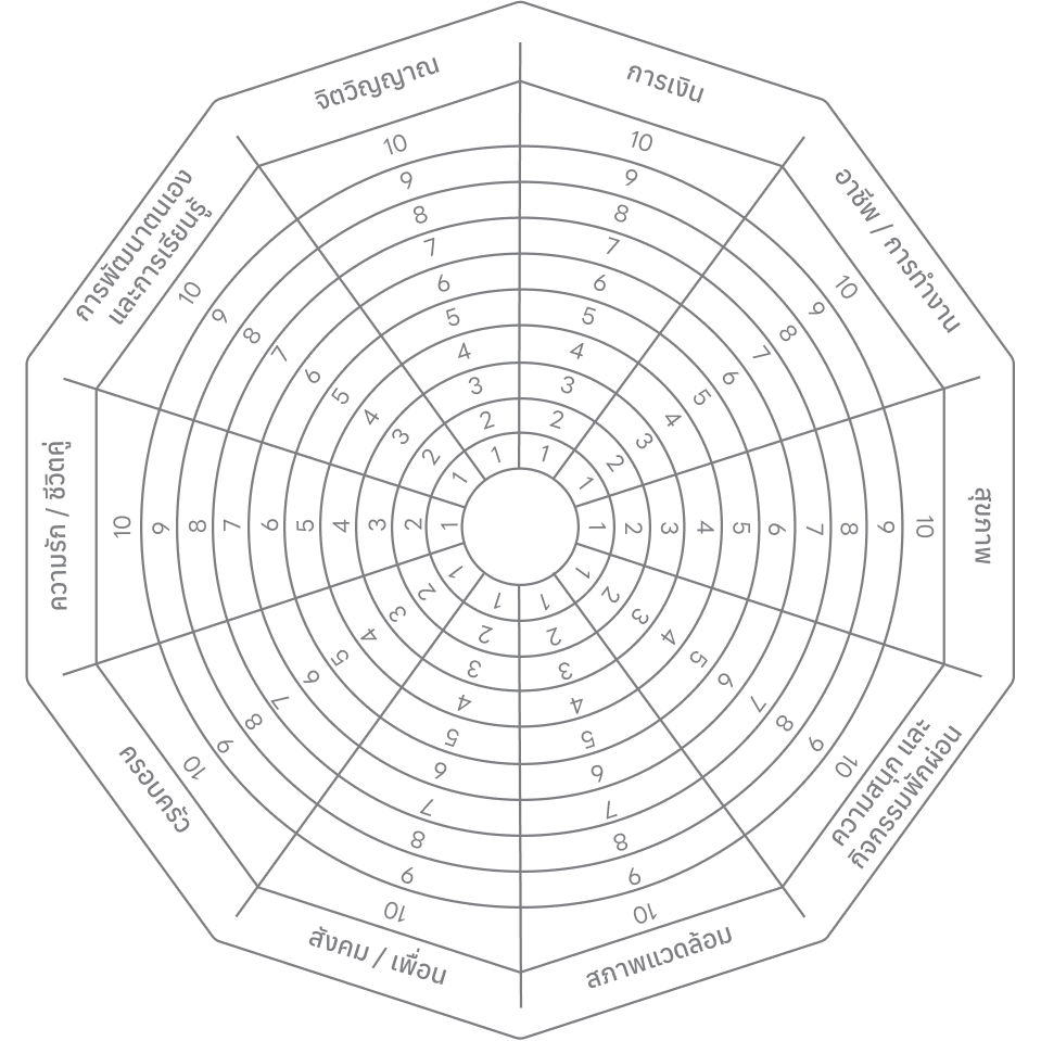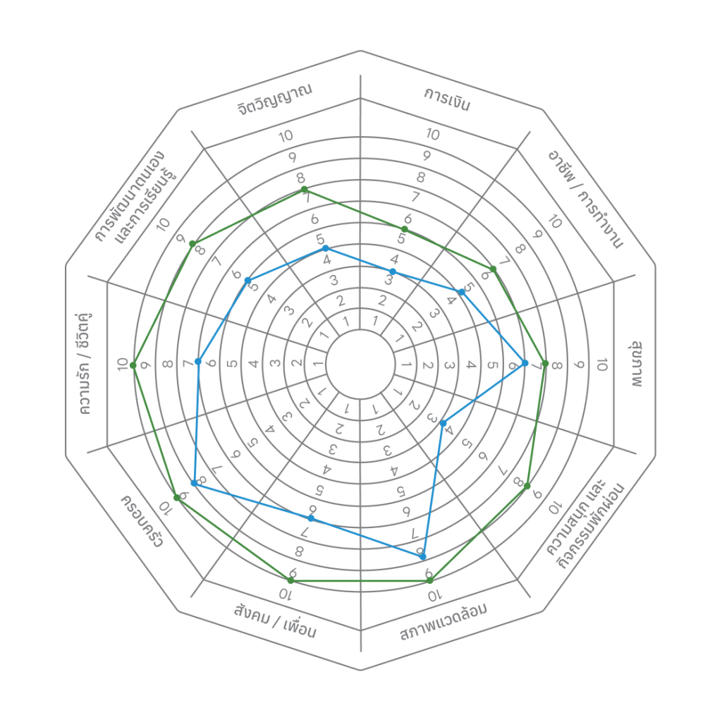 เมื่อลากจุดเรียบร้อยแล้ว คุณจะเห็นภาพชัดขึ้นว่าชีวิต “เอียงไปด้านไหนมากเกินไป” หรือ “ด้านไหนต้องฟื้นฟู”